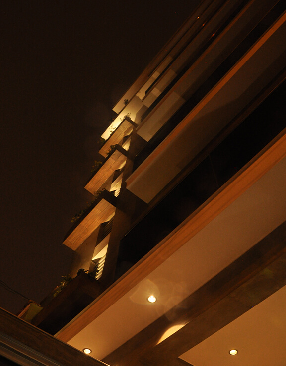 La volumetría del edificio multifamiliar constituye un paralelepípedo regular vertical de proporción 2 a 1 orientado Sur-Norte y retirado 3 m del alineamiento de la acera precedido de un cerco de 3 m de altura en parte traslúcido (ingreso) y en parte opaco (portones de garaje). La fachada del frente principal se compone asimétricamente a partir de una Terraza lineal que recorre el frente del Dormitorio Principal y la Sala- Comedor y del muro de la escalera integrada rematado por una jardinera en cada piso.